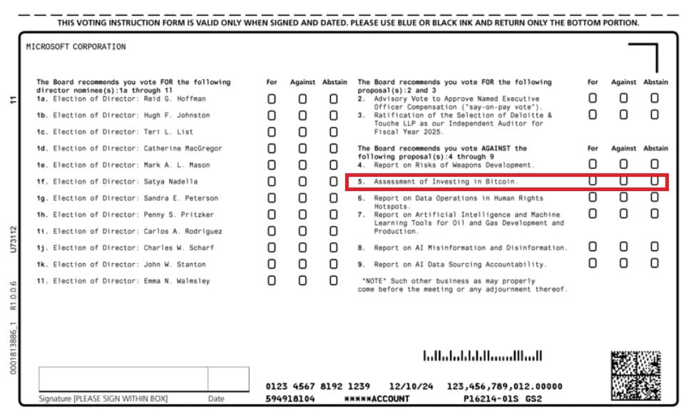 10 Microsoft to Discuss Bitcoin Investment Proposal.Conservative think tank wants 1% of assets in Bitcoin. Pitched as inflation hedge strategy. Vote scheduled for December shareholders meeting. Board urges shareholders to vote "no." Claims it's unsuitable for liquidity needs. Says existing practices are sufficient. Microsoft sits on $76 billion cash pile. 10% would equal 100,000 bitcoins. Such purchase could shock crypto market.